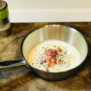 7️⃣ Pour la sauce au lard, nous allons uniquement profiter du goût du lard...car il va simplement infuser dans notre crème..nous n’allons pas le manger ! Couper votre lard en lardons et écraser votre gousse d’ail. Dans une petite casserole, verser la crème, les lardons et l’ail, poivrez, mettre à chauffer à feu doux pendant 10-15 minutes, jusqu’à petite ébullition, éteignez le feu, filmer avec du papier film, la casserole et laisser infuser ainsi une bonne vingtaine de minutes.