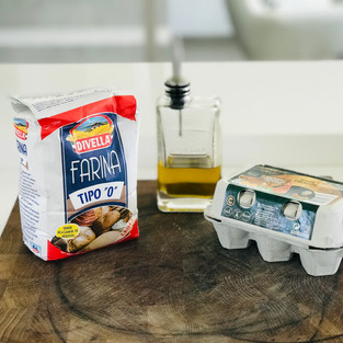 1️⃣ On commence par préparer la pâte, pour ceci, soit on mets la farine, les œufs battus et la cuillère d’huile d’olive dans la cuve d’un robot avec le crochet et on pétrit 3-4 minutes et ensuite on termine de pétrir à la main, soit on verse sa farine sur un plan de travail propre, on fait un puits, dans lequel on verse les oeufs et l’huile d’olive, et du bout des doigts on commence à ramener la farine, petits à petits sur les oeufs, jusqu’à ce qu’à force de pétrir on se retrouve avec une boule de pâtes souple.
